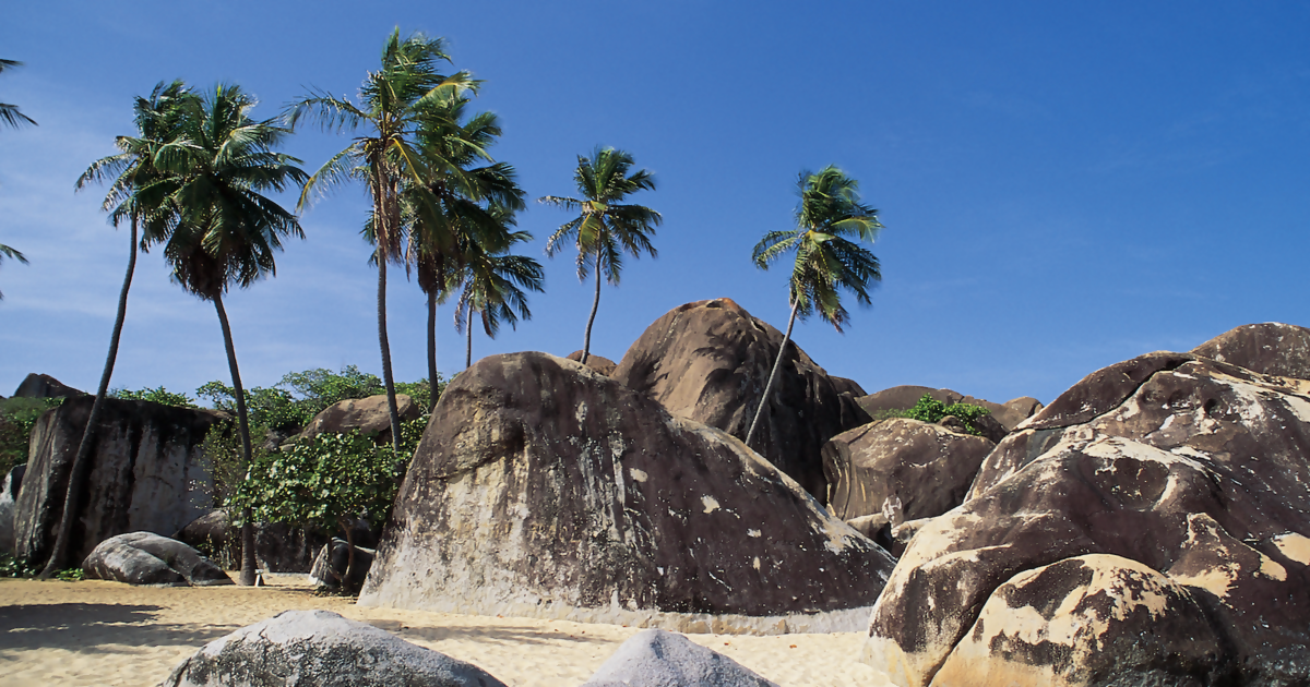 Zamislite da majka priroda gradi vlastiti vodeni park od ogromnih građevinskih blokova. Masivne granitne gromade — neke velike poput kuća — padaju preko njih Djevice Gorde obale, tvoreći tajne bazene, špilje i pješčane tunele. Kupalište (gore) su monolitno igralište oblikovano tijekom milijuna godina savršenom olujom geologije, vremena i plime.